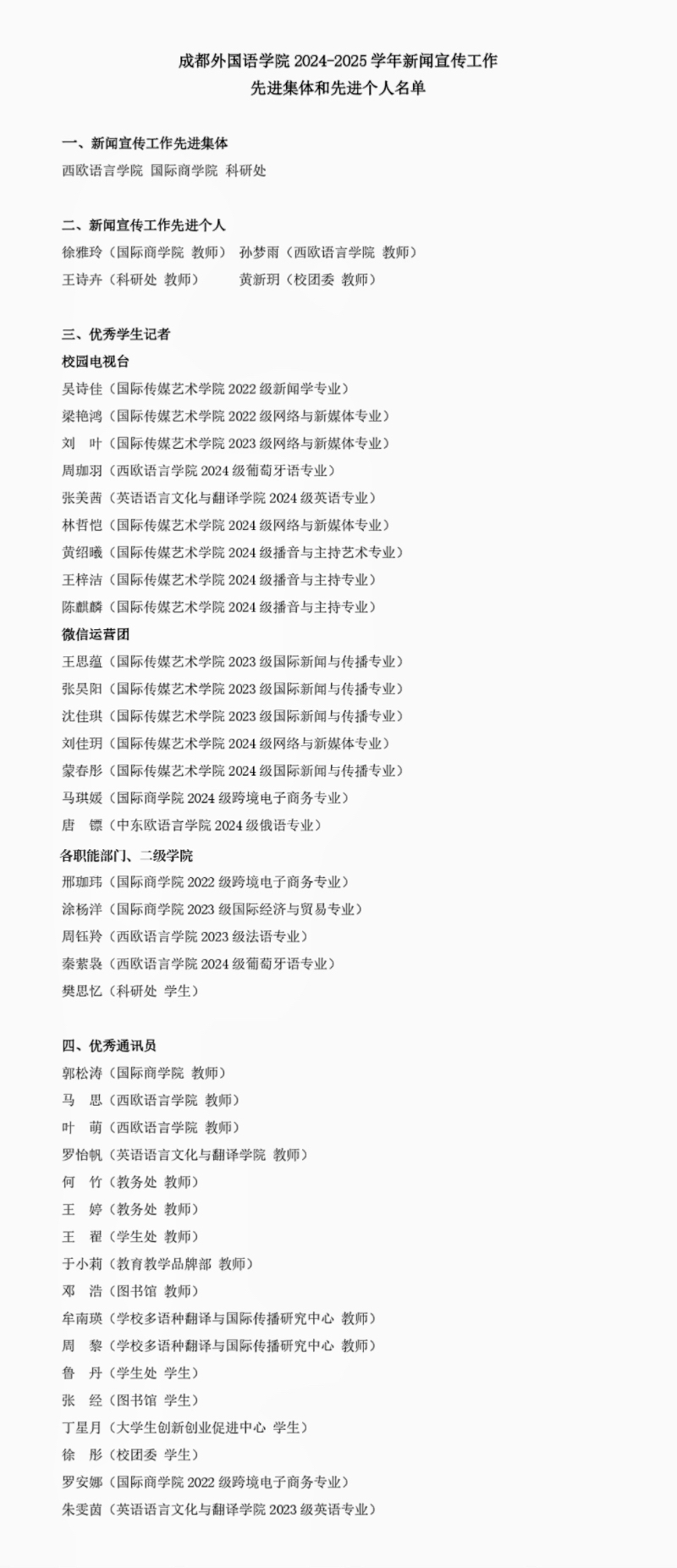 成都外国语学院2024-2025学年新闻宣传工作先进集体和先进个人名单